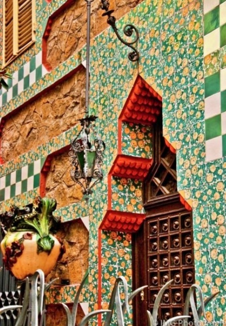 벽을 덮고 있는 생동감 넘치는 타일은 지그재그 패턴으로 배열되어 움직임과 에너지를 만들어냅니다. 화려한 철제 발코니와 문과 창문의 복잡한 조각이 건물 전체의 매력을 더합니다. 생동감 넘치는 색상, 복잡한 패턴 및 세심하게 제작된 세부 사항의 놀라운 디스플레이입니다. 건물은 파란색, 녹색 및 흰색 음영의 화려한 타일로 장식되어 눈길을 끄는 조화로운 디자인을 만듭니다. 지붕은 무어에서 영감을 받은 포탑과 복잡한 패턴으로 특히 인상적입니다. 건물의 정면은 야자나무 잎과 꽃을 비롯한 다양한 자연 요소로 장식되어 있어 자연에 대한 가우디의 매력과 자연을 자신의 디자인에 통합하려는 열망을 반영합니다.